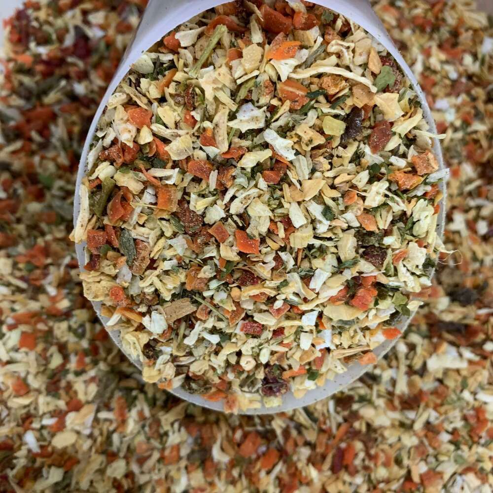Ingredientes: cúrcuma, alho granulado, cebola desidratada, cebolinha desidratada, cenoura granulada, caldo de costela, pimentão vermelho e verde, salsa desidratada.